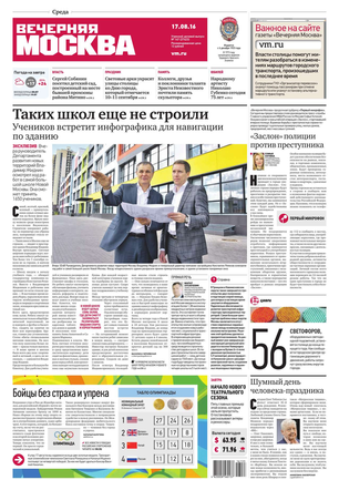 «Вечерняя Москва» — ежедневная российская вечерняя газета, старейшее из вечерних изданий в России, учрежденное в 1923 году. Выходит пять дней в неделю, кроме субботы и воскресенья. Отличается тем, что рассказывает о событиях еще не завершившегося дня. Оперативно освещает хронику и особенности жизни Москвы, охватывает все слои общества и большинство профессиональных и возрастных групп читателей.Издание представлено тремя выпусками – утренним ежедневным, вечерним (выходит три раза в неделю), еженедельным (выходит по четвергам).