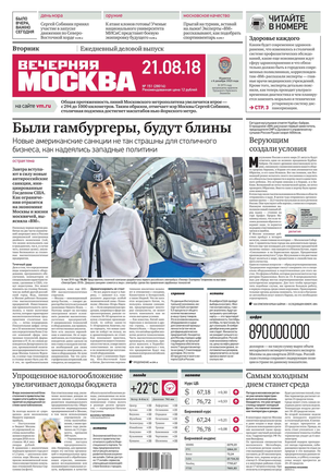 «Вечерняя Москва» — ежедневная российская вечерняя газета, старейшее из вечерних изданий в России, учрежденное в 1923 году. Выходит пять дней в неделю, кроме субботы и воскресенья. Отличается тем, что рассказывает о событиях еще не завершившегося дня. Оперативно освещает хронику и особенности жизни Москвы, охватывает все слои общества и большинство профессиональных и возрастных групп читателей.Издание представлено тремя выпусками – утренним ежедневным, вечерним (выходит три раза в неделю), еженедельным (выходит по четвергам).