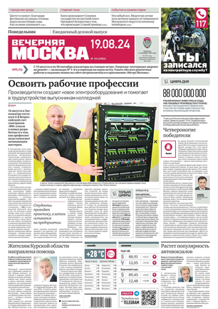 «Вечерняя Москва» — ежедневная российская вечерняя газета, старейшее из вечерних изданий в России, учрежденное в 1923 году. Выходит пять дней в неделю, кроме субботы и воскресенья. Отличается тем, что рассказывает о событиях еще не завершившегося дня. Оперативно освещает хронику и особенности жизни Москвы, охватывает все слои общества и большинство профессиональных и возрастных групп читателей.Издание представлено тремя выпусками – утренним ежедневным, вечерним (выходит три раза в неделю), еженедельным (выходит по четвергам).
