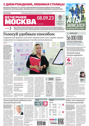 «Вечерняя Москва» — ежедневная российская вечерняя газета, старейшее из вечерних изданий в России, учрежденное в 1923 году. Выходит пять дней в неделю, кроме субботы и воскресенья. Отличается тем, что рассказывает о событиях еще не завершившегося дня. Оперативно освещает хронику и особенности жизни Москвы, охватывает все слои общества и большинство профессиональных и возрастных групп читателей.Издание представлено тремя выпусками – утренним ежедневным, вечерним (выходит три раза в неделю), еженедельным (выходит по четвергам).