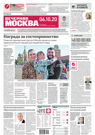 «Вечерняя Москва» — ежедневная российская вечерняя газета, старейшее из вечерних изданий в России, учрежденное в 1923 году. Выходит пять дней в неделю, кроме субботы и воскресенья. Отличается тем, что рассказывает о событиях еще не завершившегося дня. Оперативно освещает хронику и особенности жизни Москвы, охватывает все слои общества и большинство профессиональных и возрастных групп читателей.Издание представлено тремя выпусками – утренним ежедневным, вечерним (выходит три раза в неделю), еженедельным (выходит по четвергам).
