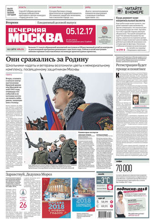 «Вечерняя Москва» — ежедневная российская вечерняя газета, старейшее из вечерних изданий в России, учрежденное в 1923 году. Выходит пять дней в неделю, кроме субботы и воскресенья. Отличается тем, что рассказывает о событиях еще не завершившегося дня. Оперативно освещает хронику и особенности жизни Москвы, охватывает все слои общества и большинство профессиональных и возрастных групп читателей.Издание представлено тремя выпусками – утренним ежедневным, вечерним (выходит три раза в неделю), еженедельным (выходит по четвергам).