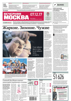«Вечерняя Москва» — ежедневная российская вечерняя газета, старейшее из вечерних изданий в России, учрежденное в 1923 году. Выходит пять дней в неделю, кроме субботы и воскресенья. Отличается тем, что рассказывает о событиях еще не завершившегося дня. Оперативно освещает хронику и особенности жизни Москвы, охватывает все слои общества и большинство профессиональных и возрастных групп читателей.Издание представлено тремя выпусками – утренним ежедневным, вечерним (выходит три раза в неделю), еженедельным (выходит по четвергам).