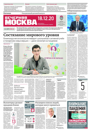 «Вечерняя Москва» — ежедневная российская вечерняя газета, старейшее из вечерних изданий в России, учрежденное в 1923 году. Выходит пять дней в неделю, кроме субботы и воскресенья. Отличается тем, что рассказывает о событиях еще не завершившегося дня. Оперативно освещает хронику и особенности жизни Москвы, охватывает все слои общества и большинство профессиональных и возрастных групп читателей.Издание представлено тремя выпусками – утренним ежедневным, вечерним (выходит три раза в неделю), еженедельным (выходит по четвергам).