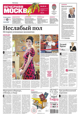 «Вечерняя Москва» — ежедневная российская вечерняя газета, старейшее из вечерних изданий в России, учрежденное в 1923 году. Выходит пять дней в неделю, кроме субботы и воскресенья. Отличается тем, что рассказывает о событиях еще не завершившегося дня. Оперативно освещает хронику и особенности жизни Москвы, охватывает все слои общества и большинство профессиональных и возрастных групп читателей.Издание представлено тремя выпусками – утренним ежедневным, вечерним (выходит три раза в неделю), еженедельным (выходит по четвергам).