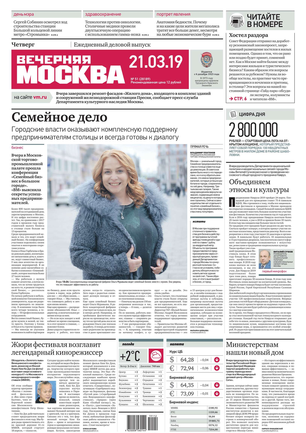 «Вечерняя Москва» — ежедневная российская вечерняя газета, старейшее из вечерних изданий в России, учрежденное в 1923 году. Выходит пять дней в неделю, кроме субботы и воскресенья. Отличается тем, что рассказывает о событиях еще не завершившегося дня. Оперативно освещает хронику и особенности жизни Москвы, охватывает все слои общества и большинство профессиональных и возрастных групп читателей.Издание представлено тремя выпусками – утренним ежедневным, вечерним (выходит три раза в неделю), еженедельным (выходит по четвергам).