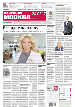 «Вечерняя Москва» — ежедневная российская вечерняя газета, старейшее из вечерних изданий в России, учрежденное в 1923 году. Выходит пять дней в неделю, кроме субботы и воскресенья. Отличается тем, что рассказывает о событиях еще не завершившегося дня. Оперативно освещает хронику и особенности жизни Москвы, охватывает все слои общества и большинство профессиональных и возрастных групп читателей.Издание представлено тремя выпусками – утренним ежедневным, вечерним (выходит три раза в неделю), еженедельным (выходит по четвергам).