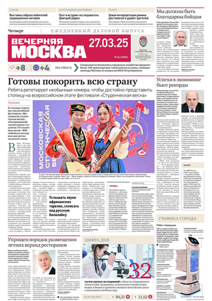 «Вечерняя Москва» — ежедневная российская вечерняя газета, старейшее из вечерних изданий в России, учрежденное в 1923 году. Выходит пять дней в неделю, кроме субботы и воскресенья. Отличается тем, что рассказывает о событиях еще не завершившегося дня. Оперативно освещает хронику и особенности жизни Москвы, охватывает все слои общества и большинство профессиональных и возрастных групп читателей.Издание представлено тремя выпусками – утренним ежедневным, вечерним (выходит три раза в неделю), еженедельным (выходит по четвергам).