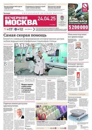 «Вечерняя Москва» — ежедневная российская вечерняя газета, старейшее из вечерних изданий в России, учрежденное в 1923 году. Выходит пять дней в неделю, кроме субботы и воскресенья. Отличается тем, что рассказывает о событиях еще не завершившегося дня. Оперативно освещает хронику и особенности жизни Москвы, охватывает все слои общества и большинство профессиональных и возрастных групп читателей.Издание представлено тремя выпусками – утренним ежедневным, вечерним (выходит три раза в неделю), еженедельным (выходит по четвергам).