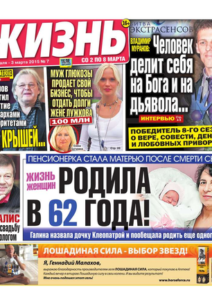 Еженедельная газета, предназначенная для семейного чтения. Основные рубрики: самые скандальные и интересные события прошедшей недели, политический комментарий Леонида Шахова, пикантные истории из звездной жизни, советы профессионального психолога, действенные рецепты здоровья, гороскоп, кроссворд, конкурсы, сканворды, розыгрыши билетов в кинотеатры и множество других призов. Приложения к газете «Жизнь»: «Телеэкран» - телепрограмма с подробными анонсами кино и сериалов, «Овертайм» - спортивное обозрение.